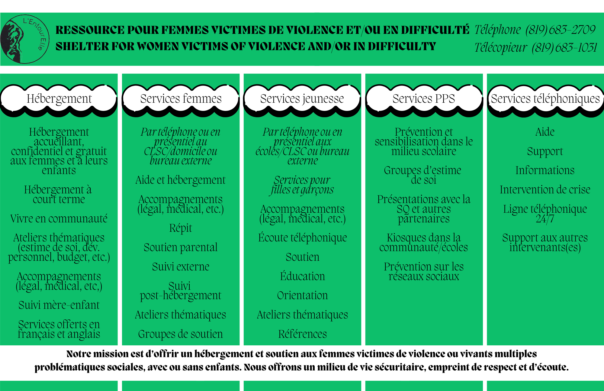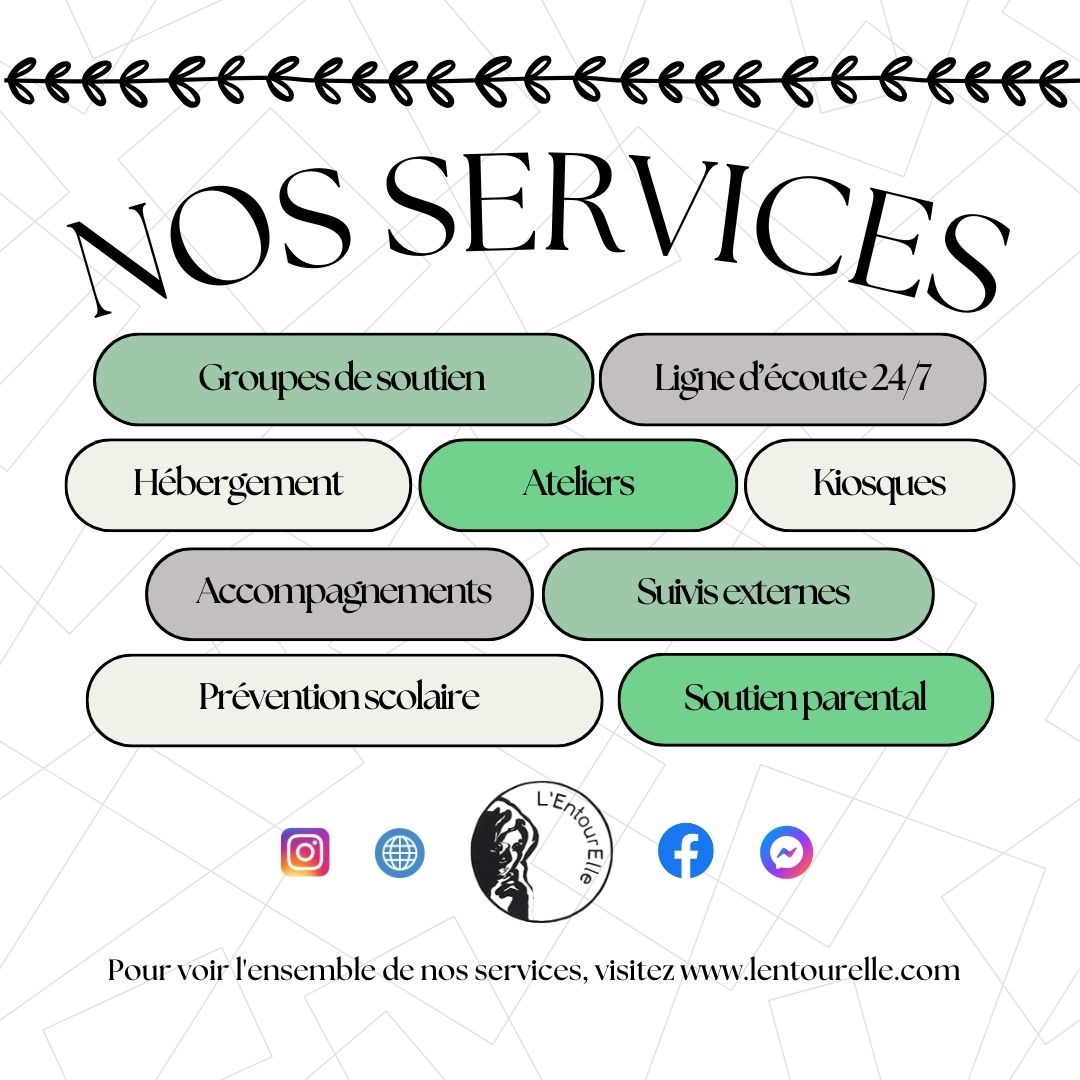 L'EntourElle est un organisme communautaire qui offre de l'aide, de l'hébergement et un accompagnement aux femmes victimes de violence et/ou en difficulté, avec ou sans enfants.